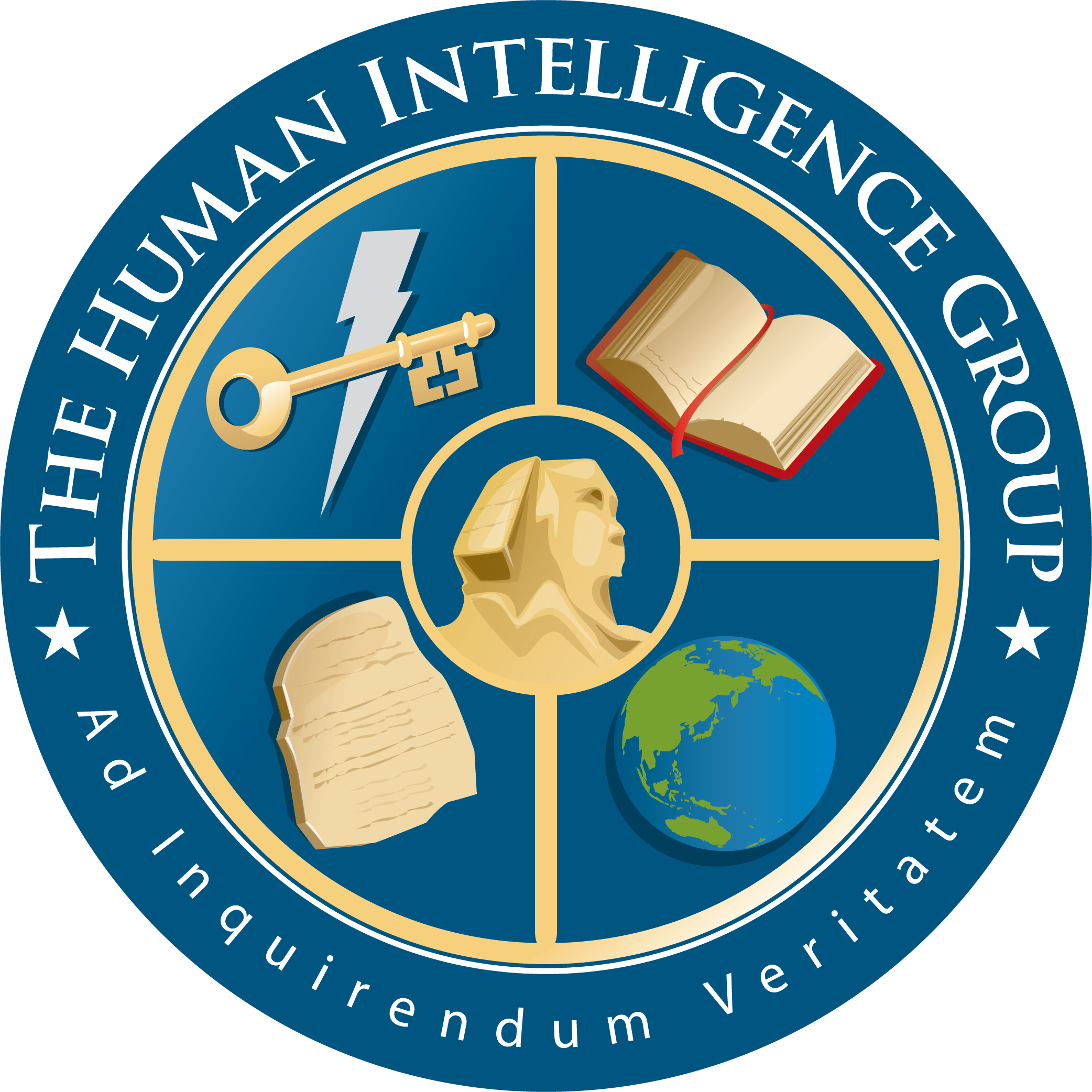 HUMINT Group Seal, a blue circle quartered by gold lines with a Sphinx, Globe, Rosetta Stone, Book, and Lightning-Key. Motto: Ad Inquirendum Veritatem.